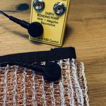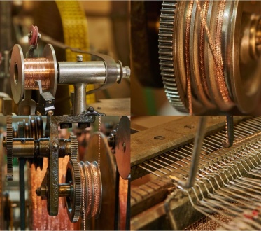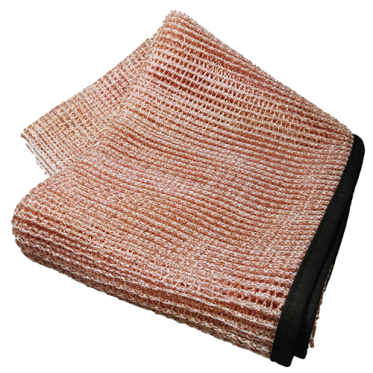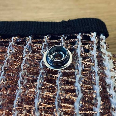 Das Kupfergeflecht stammt aus regionaler Fertigung in Vorarlberg. Der Garn wird mit über 2800 Metern Kupferdraht umwickelt, gewoben und auf Mass zugeschnitten – alles in Handarbeit.
